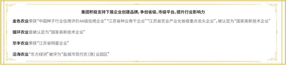公司除開(kāi)展日常經(jīng)營(yíng)業(yè)務(wù)外,還高度重視農(nóng)業(yè)科技運(yùn)用,孵化培育有國(guó)家高新技術(shù)企業(yè)2家,設(shè)有1個(gè)博士后工作站、3個(gè)研究生工作站,建有農(nóng)業(yè)部可再生能源清潔化利用實(shí)驗(yàn)基地、江蘇省優(yōu)質(zhì)稻麥工程技術(shù)研究中心、鹽城市工程技術(shù)研究中心、鹽城市市級(jí)企業(yè)技術(shù)中心、鹽城市農(nóng)機(jī)化科技示范基地,已通過(guò)國(guó)家、省級(jí)審定品種20個(gè),申報(bào)各類專利84項(xiàng),不斷探索和應(yīng)用現(xiàn)代農(nóng)業(yè)科技,為傳統(tǒng)農(nóng)業(yè)賦能增效。