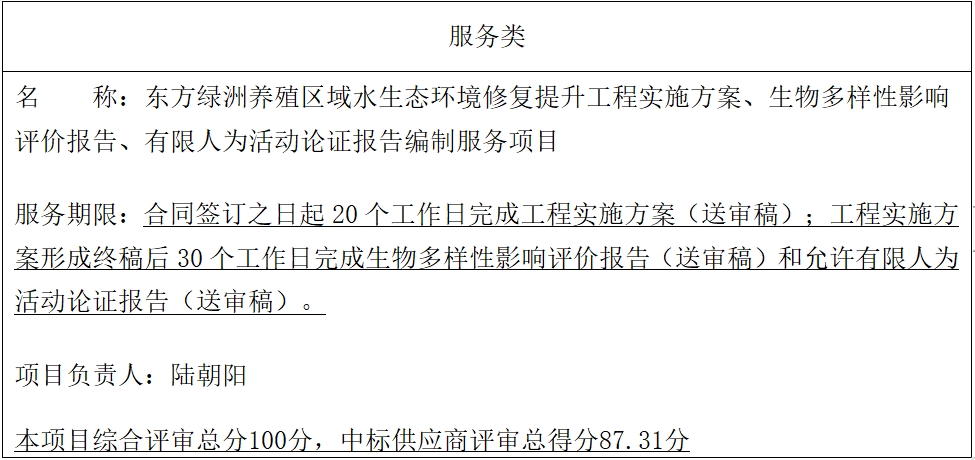 東方綠洲養殖區域水生態環境修復提升工程實施方案、生物多樣性影響評價報告、有限人為活動論證報告編制服務項目中標結果公告
