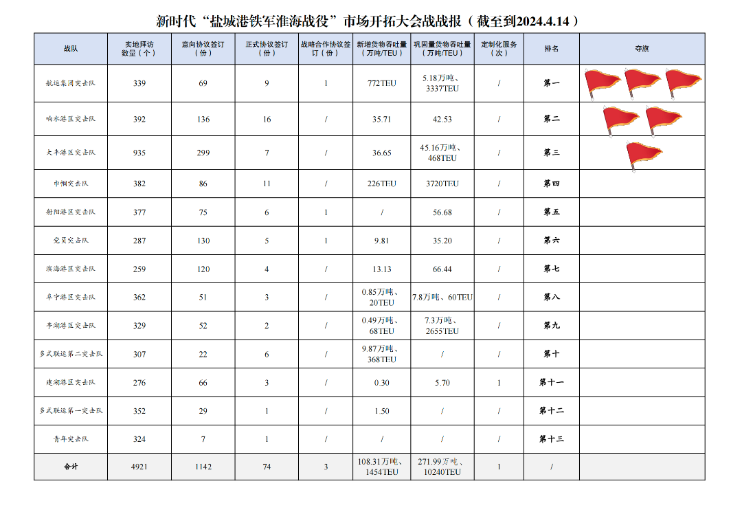 1.累計(jì)拜訪客戶數(shù)量4921家:其中大豐港區(qū)突擊隊(duì)935家,響水港區(qū)突擊隊(duì)392家,巾幗突擊隊(duì)382家,射陽港區(qū)突擊隊(duì)377家,阜寧港區(qū)突擊隊(duì)362家,多式聯(lián)運(yùn)第一突擊隊(duì)352家,航運(yùn)集團(tuán)突擊隊(duì)339家,亭湖港區(qū)突擊隊(duì)329家,青年突擊隊(duì)324家,多式聯(lián)運(yùn)第二突擊隊(duì)307家,黨員突擊隊(duì)287家,建湖港區(qū)突擊隊(duì)276家,濱海港區(qū)突擊隊(duì)259家。