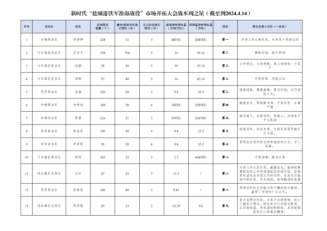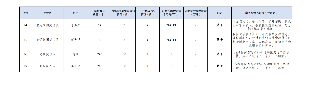 第二名:大豐港區(qū)突擊隊(duì) 夏迎冬(拜訪客戶128家,簽訂意向協(xié)議106份,簽訂正式協(xié)議5份,新增貨物吞吐量10萬噸,鞏固量貨物吞吐量45.16萬噸)