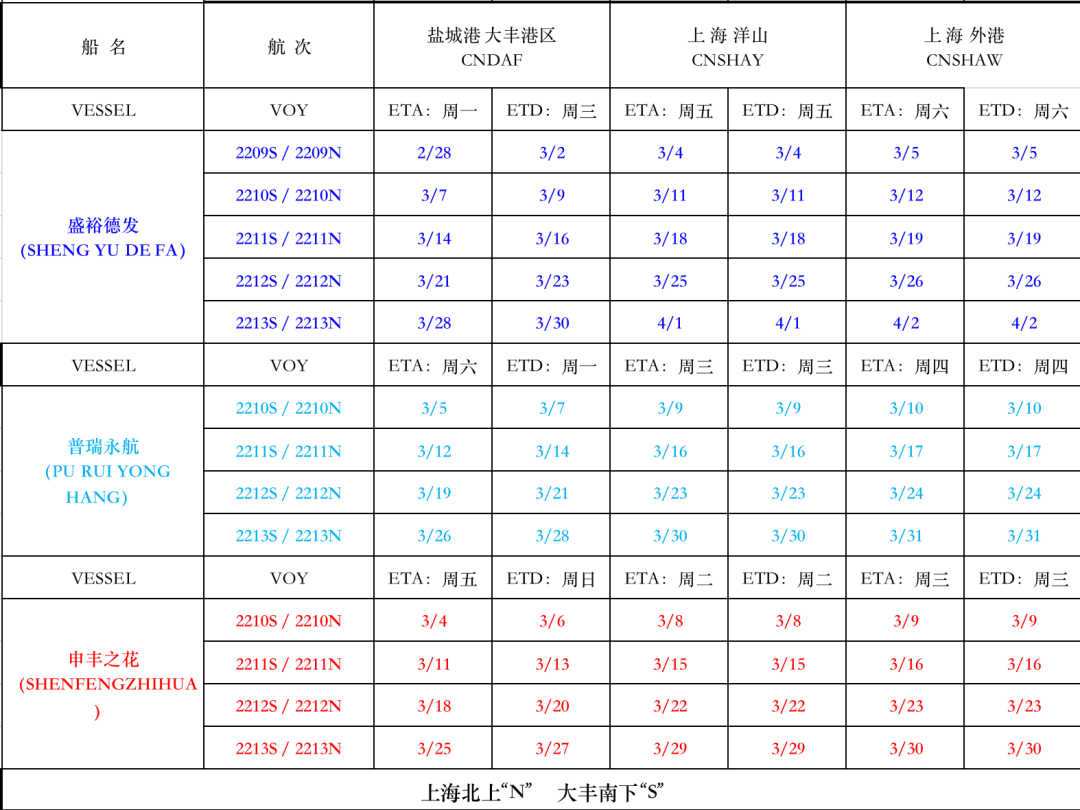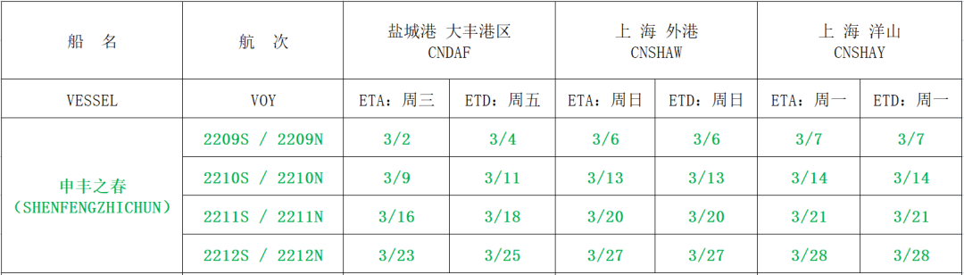 滬鹽專線2022年3月份沿海線船期表