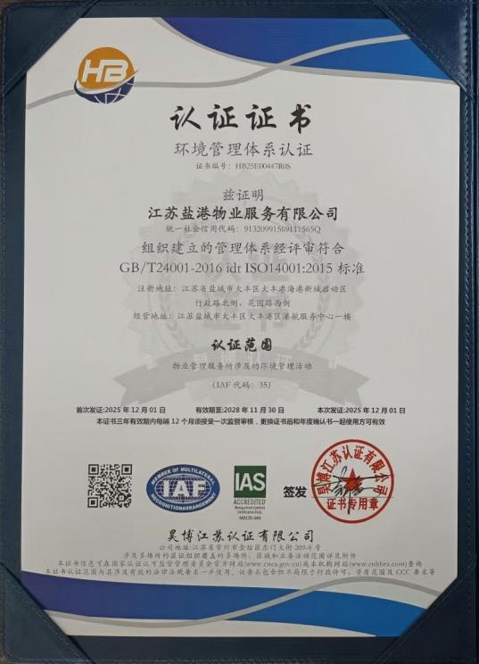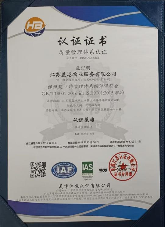 作為鹽城港集團的物業管理企業,鹽港物業始終秉持“客戶至上、精益求精、責任擔當” 的核心價值觀,專注于為綜合體辦公樓、住宅小區等各類物業項目提供全方位、高品質的物業服務。此次認證過程中,審核機構依據 ISO 相關國際標準,對公司的管理體系進行了全流程、多維度的嚴苛評審,涵蓋制度建設、流程執行、風險管控、服務質量、環境治理、員工權益保障、社會責任履行等多個關鍵環節。通過查閱資料、現場核查、人員訪談等多種方式的全面檢驗,鹽港物業的管理體系因其完整性、合規性、有效性得到了審核專家的高度認可,最終順利通過全部認證。