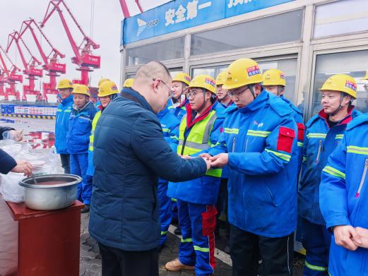 在射陽港區,凜冽海風裹挾著濕氣,體感溫度低至零下十余度。港區領導帶領“暖心送粥隊”穿梭于各個作業區,將精心熬制的臘八粥逐一送到在崗員工手中。為契合一線員工“寒夜堅守、高強度作業”的工作特性,港泊鶴灣酒店提前數日籌備,餐飲團隊精選東北糯米、寧夏紅棗、新疆核桃等十余種藥食同源食材,特別添加燕麥、芡實等耐饑養胃原料,既遵循“七寶五味粥”傳統古制,又強化了暖身抗寒功效。剛完成船舶系纜作業的員工們搓著凍紅的雙手圍坐分享,滾燙的粥香不僅驅散了寒意,更映亮了一張張淳樸真摯的笑容。