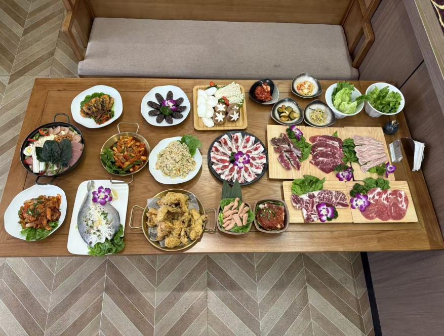 598元套餐(多人):牛五花、雪花牛板腱、LA 牛排、部隊火鍋、整只炸雞等韓式經典,搭配南瓜湯、水果茶、生菜無限續(xù),聚餐氛圍熱烈。