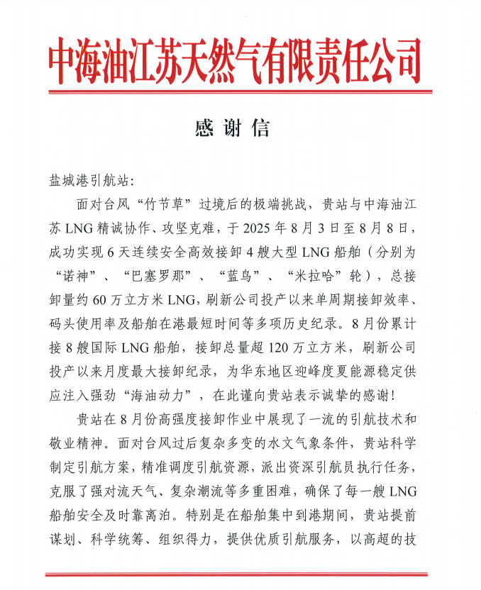 近日,鹽城港引航站收到中海油江蘇天然氣有限責任公司發來的感謝信。信中對引航站在臺風“竹節草”過境后的復雜局面下,高效完成LNG船舶接卸任務的專業服務予以高度認可,特別提及創下的多項紀錄,生動展現了引航站作為“水上國門”守護者,在區域能源供應中的硬核擔當。
