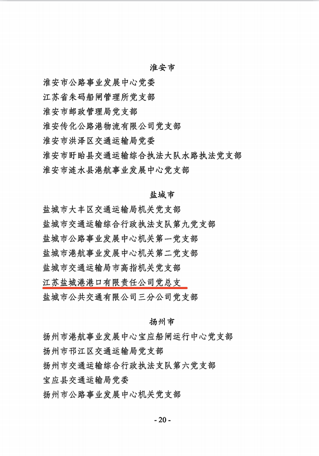 近日,中共江蘇省交通運輸行業委員會印發通知,對全省交通運輸行業優秀共產黨員、優秀黨務工作者和先進基層黨組織進行表揚,江蘇鹽城港港口有限責任公司黨總支榮獲“全省交通運輸行業先進基層黨組織”榮譽稱號。