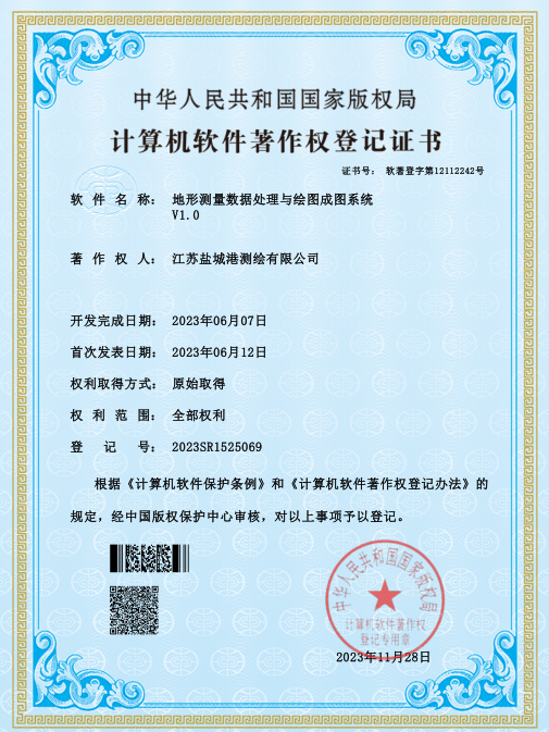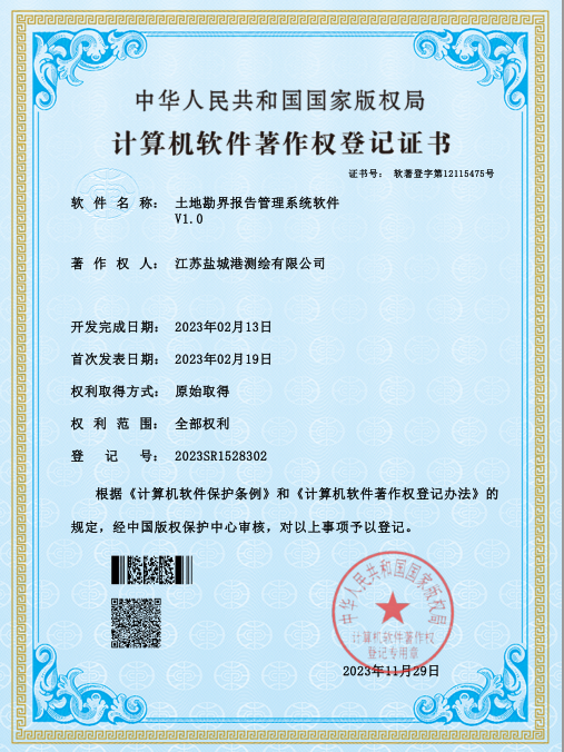 鹽城港港航勘測(cè)設(shè)計(jì)公司一直高度重視技術(shù)發(fā)展創(chuàng)新和知識(shí)產(chǎn)權(quán)保護(hù),現(xiàn)已獲得測(cè)繪OA綜合管理系統(tǒng)軟件、地形測(cè)量數(shù)據(jù)處理與繪圖成圖系統(tǒng)、航空攝影測(cè)量數(shù)據(jù)采集軟件、三維建模數(shù)據(jù)處理和信息管理軟件、土地勘界報(bào)告管理系統(tǒng)軟件五項(xiàng)軟件著作權(quán)。