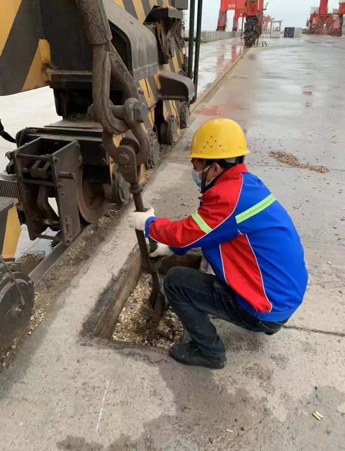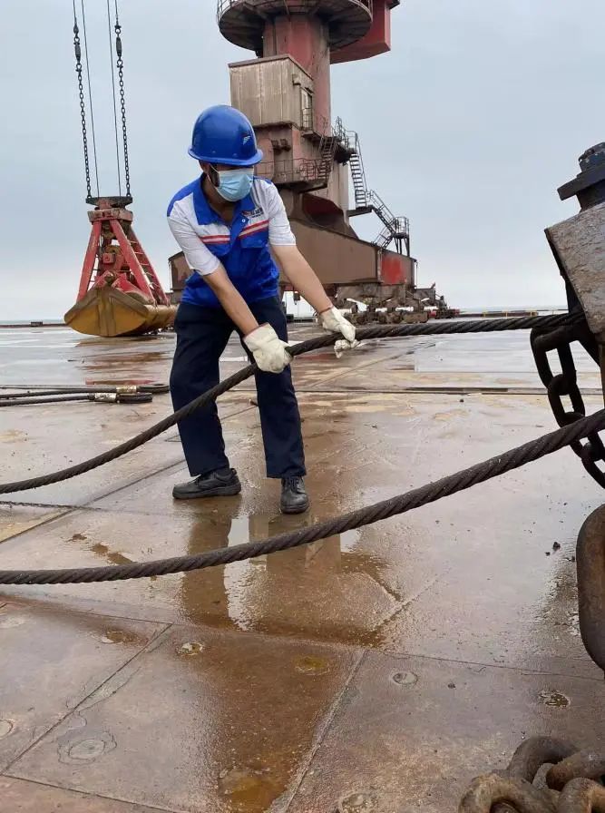 機(jī)修工將自己化身為“大力士”,重達(dá)上百斤的門機(jī)防風(fēng)錨鏈,對于經(jīng)常進(jìn)行防臺防汛應(yīng)急演練的港口人來說,早已不在話下,門機(jī)拉索在他們手中順勢下拉便可固定,這是他們書寫港口平安篇章的獨(dú)特方式。