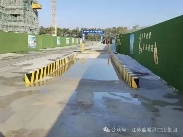 工程車駛入長方形水池,兩側黃黑警示樁如衛士列隊。這里是車輛的“美顏艙”!車輪裹挾的泥土被水流循環沖刷,污水沉淀后重復利用,確保每一輛出場車輛都“凈身出戶”,絕不讓泥漿污染城市道路。圍擋上“文明健康 有你有我”的標語,正是它的環保宣言。